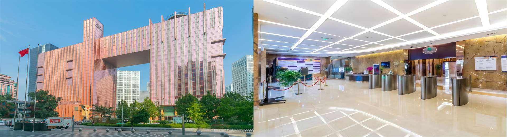 北京华彬中心位于长安街旁、建国门外,占据CBD核心区位,写字楼面积5.3万平方米,地上23层、地下5层,由甲级写 字楼、商务中心、商业、剧院、俱乐部及酒店等多业态组成的复合式大型商业综合体,为长安街新地标性建筑之一。华彬中心由世界著名建筑师事务所“丹下健三”担纲设计、其建筑风格独特、两栋方形建筑形成恢宏的“凯旋门”造型、玫瑰金整体色 调华贵、时尚。改造后的华彬中心充分运用了环保元素,极富现代感的玻璃幕墙在传达全采光的设计理念同。华彬中心提供最先进的办公设备及五星级的配套服务、专为会员量身定制的多功能综合剧院,是京城首家实现可转换功能的顶级剧院,由被誉为世界“歌剧之王”的多明戈先生担任首席艺术顾问。由世界知名酒店管理集团的华彬费尔蒙酒店,将为写字楼客户提供世界一 流的酒店配套及服务。